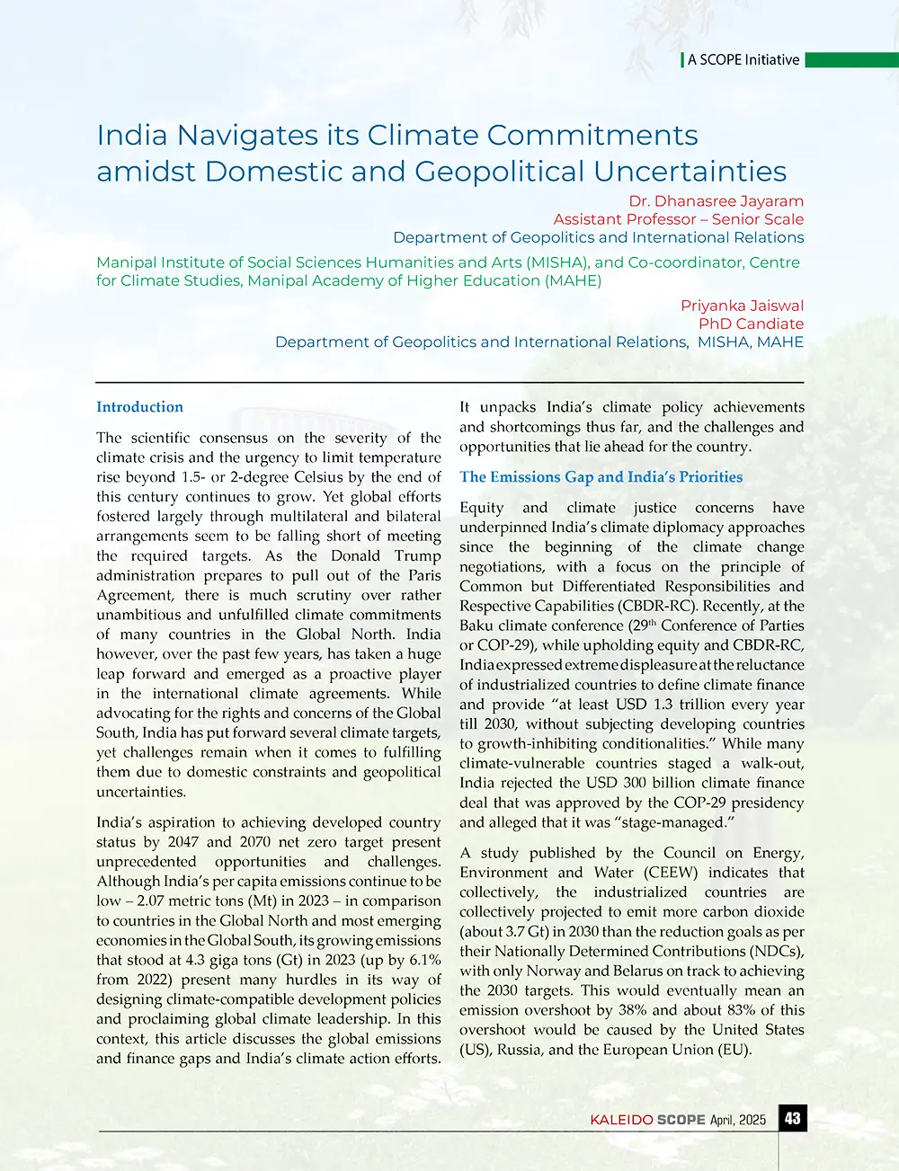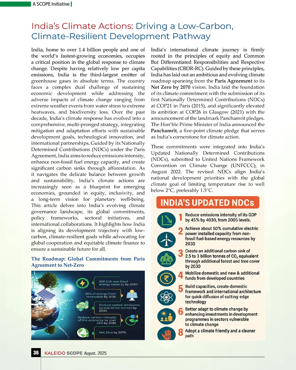 Over the past decade, India’s climate response has evolved into a comprehensive, multi-pronged strategy, integrating mitigation and adaptation efforts with sustainable development goals, technological innovation, and international partnerships. Guided by its Nationally Determined Contributions (NDCs) under the Paris Agreement, India aims to reduce emissions intensity, enhance non-fossil fuel energy capacity, and create significant carbon sinks through afforestation. As it navigates the delicate balance between growth and sustainability, India’s climate actions are increasingly seen as a blueprint for emerging economies, grounded in equity, inclusivity, and a long-term vision for planetary well-being. This article delves into India’s evolving climate governance landscape, its global commitments, policy frameworks, sectoral initiatives, and international collaborations. It highlights how India is aligning its development trajectory with lowcarbon, climate-resilient goals while advocating for global cooperation and equitable climate finance to ensure a sustainable future for all.