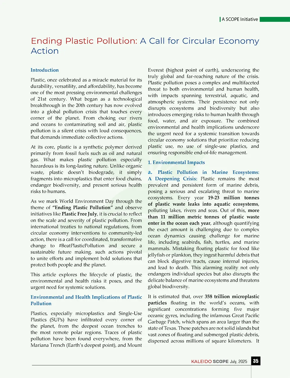 Plastic, once celebrated as a miracle material for its durability, versatility, and affordability, has become one of the most pressing environmental challenges of 21st century. What began as a technological breakthrough in the 20th century has now evolved into a global pollution crisis that touches every corner of the planet. From choking our rivers and oceans to contaminating soil and air, plastic pollution is a silent crisis with loud consequences, that demands immediate collective actions. This article explores the lifecycle of plastic, the environmental and health risks it poses, and the urgent need for systemic solutions.