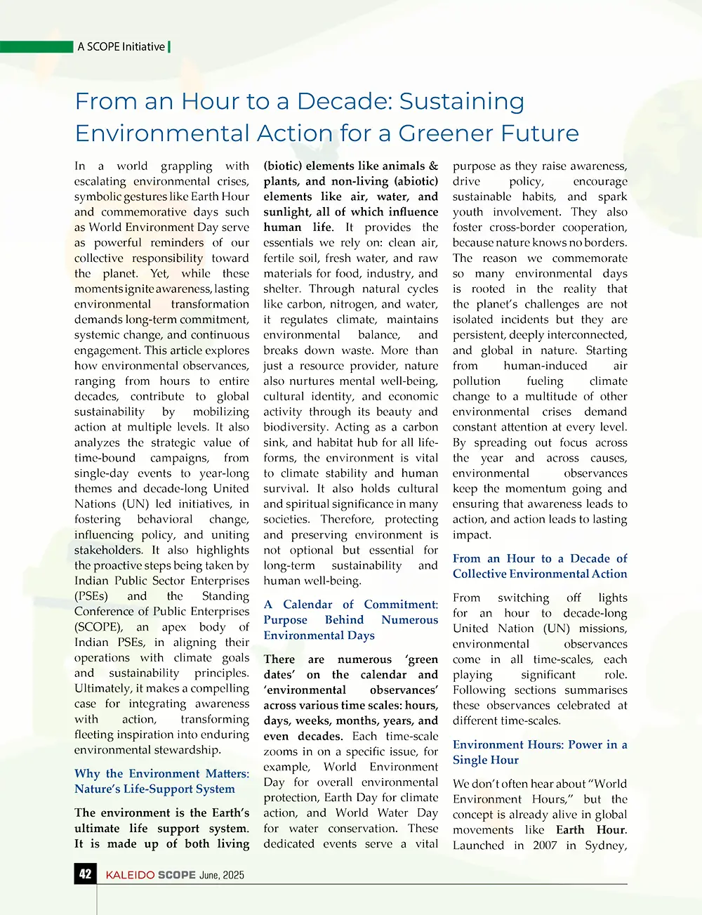 In a world grappling with escalating environmental crises, symbolic gestures like Earth Hour and commemorative days such as World Environment Day serve as powerful reminders of our collective responsibility toward the planet. Yet, while these moments ignite awareness, lasting environmental transformation demands long-term commitment, systemic change, and continuous engagement. This article explores how environmental observances, ranging from hours to entire decades, contribute to global sustainability by mobilizing action at multiple levels. It also analyzes the strategic value of time-bound campaigns, from single-day events to year-long themes and decade-long United Nations (UN) led initiatives, in fostering behavioral change, influencing policy, and uniting stakeholders. It also highlights the proactive steps being taken by Indian Public Sector Enterprises (PSEs) and the Standing Conference of Public Enterprises (SCOPE), an apex body of Indian PSEs, in aligning their operations with climate goals and sustainability principles. Ultimately, it makes a compelling case for integrating awareness with action, transforming fleeting inspiration into enduring environmental stewardship.