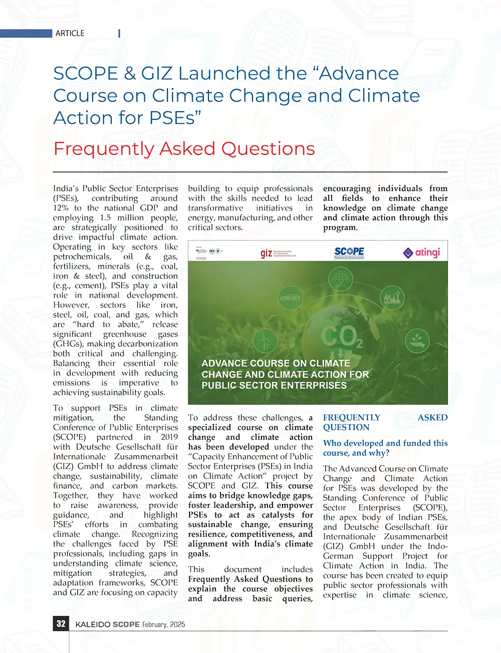 To support PSEs in climate mitigation, the Standing Conference of Public Enterprises (SCOPE) partnered with Deutsche Gesellschaft für Internationale Zusammenarbeit (GIZ) GmbH in 2019 to address climate change, sustainability, finance, and carbon markets. Their collaboration focuses on awareness, guidance, and capacity building to equip PSE professionals with essential skills. Under the “Capacity Enhancement of PSEs in India on Climate Action” project, a specialized course has been developed to bridge knowledge gaps and foster leadership. This document includes FAQs to explain course objectives, address key queries, and encourage individuals from all sectors to enhance their understanding of climate action.