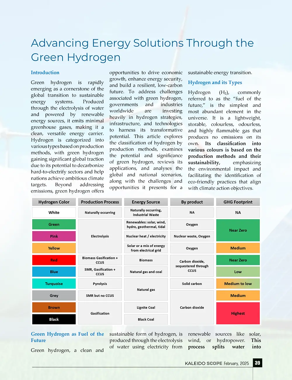 Green hydrogen is becoming a key pillar in the global shift toward sustainable energy. Produced via water electrolysis using renewable energy, it generates minimal greenhouse gas emissions, making it a clean and adaptable energy carrier. Among various hydrogen types, green hydrogen is gaining momentum for its role in decarbonizing hard-to-electrify sectors and supporting climate goals. It also fosters economic growth, energy security, and resilience. Governments and industries are investing in strategies, infrastructure, and technologies to overcome challenges. This article explores hydrogen classification, green hydrogen’s potential, its applications, and the global and national landscape, highlighting key opportunities and challenges.